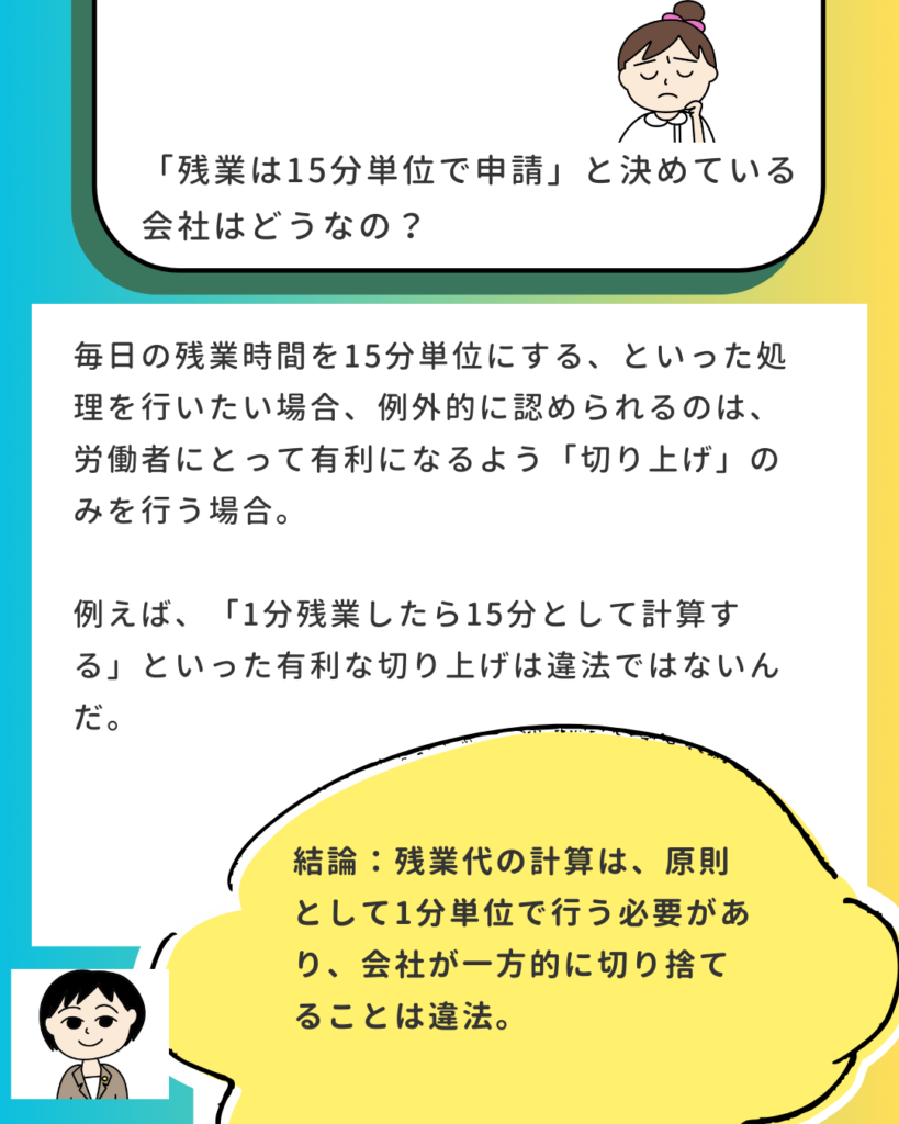 - 例: 1分残業したら、サービスとして15分として計算し残業代を支払う。