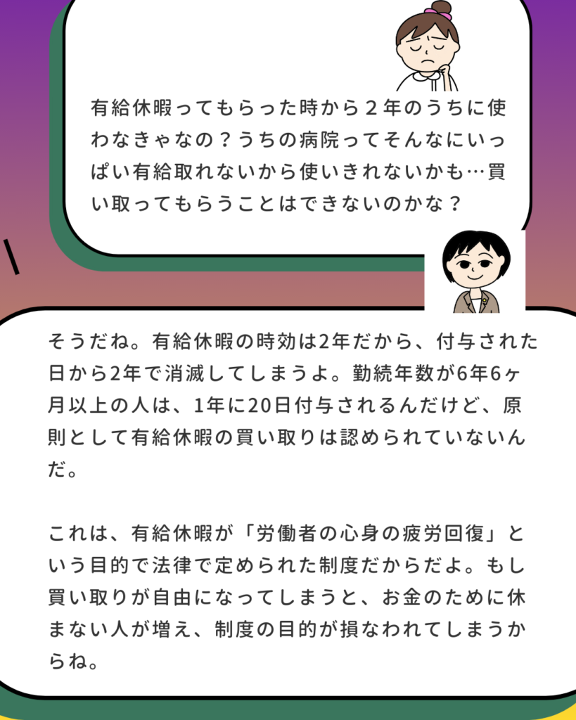 | ② 時効により消滅する分 | 2年の時効が迫り、消滅することが確定した有給について、会社が慰労金として買い取る場合があります。 |
