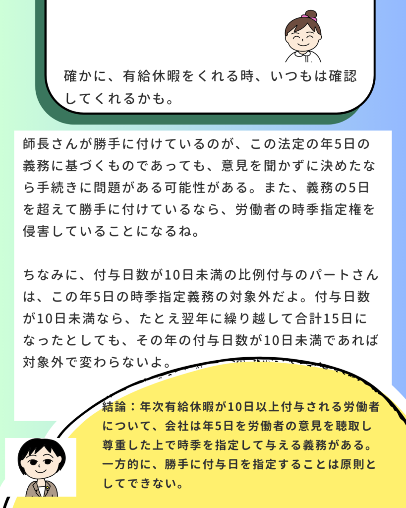 - 対象: 5日を超える部分の有給休暇についてのみ、会社が取得日を指定できます。