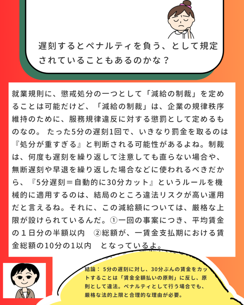 • 違法の可能性: 会社がこの規定を「減給の制裁」として利用したとしても、5分の軽微な違反に対して30分分の賃金をカットするという行為は、そのペナルティの程度が社会通念上不合理であり、権利の濫用として違法と判断される可能性があります。