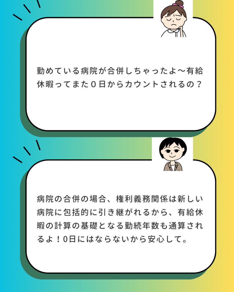 - 病院合併では、労働契約は丸ごと引き継がれるため、有給休暇の残日数も勤続年数も通算されます。