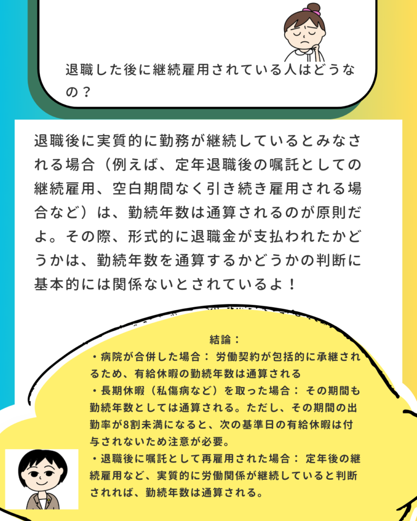 このルールも、当然ながら合併によって引き継がれます。 (例:合併前の病院で10年正職員、その後2年嘱託だった人は、合併後の病院でも「勤続12年」を基礎として有給休暇が付与されます。)